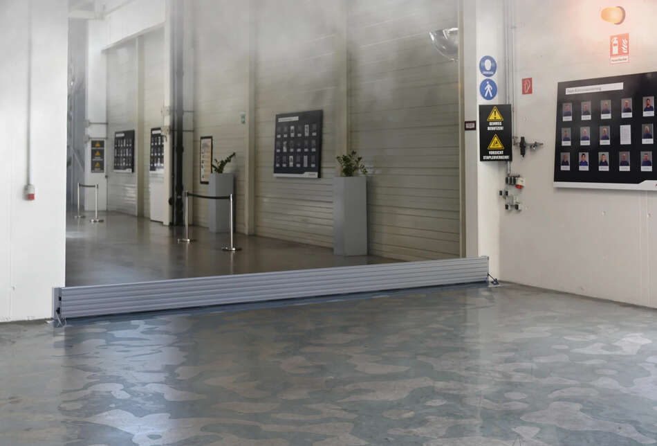 La difficoltà è stata l’installazione del portone a filo parete su un fronte di oltre 13 metri di lunghezza. Il portone è stato inoltre costruito in modo che la ferramenta sia il meno possibile visibile dall’esterno. Le porte sono completamente isolate termicamente.